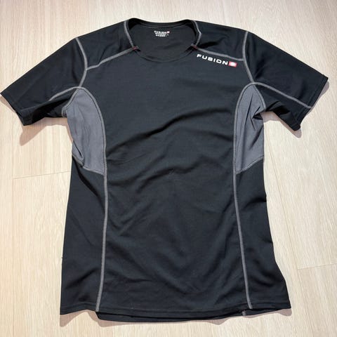 Fusion Sport Herre Træningstop i størrelse XL. Toppen har en kombination af rød og hvid farve med sorte kanter. Materialet er elastisk og egnet til forskellige sportsaktiviteter, men nok primært tiltænkt triathlon.