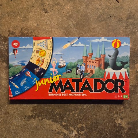 Børnenes eget Matador- spil, Alga, Tilpasset det danske originalspil, så også mindre børn får chancen for at opleve de ægte Matador-stemning. Man kan købe alt lige fra en lækker sportsvogn og en slikbutik til det store lykkehjul i tivoli. derefter kan du opkræve leje af de andre spillere, når de lander på dine eventyrfelter. Bare køb, prøv lykken, tag en taxa og byt dine eventyrkort til nye. Ved at udnytte alle de muligheder og chancer du får i dette klassiske spil, kan du blive den rigeste spiller og dermed spillets Junior Matador. 2-6 spillere, fra 5 år, ca 40 min. Fra IKKE RYGER HJEM. Sender gerne, dog ikke med fiks færdig, porto oveni