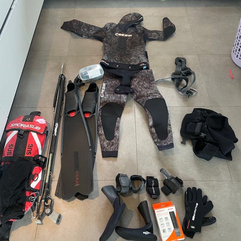 Cressi XL våddragt sæt til undervandsjagt i camouflagefarve. Sættet inkluderer 2 delt dragt, handsker 2XL; sokker XL; hætte; bælte med 5 vægte; finner 47/48; harpun; kniv; fangstsnor og reparationsæt. Materialet er neopren. Fremstår som nyt; kun brugt 1/2 time.