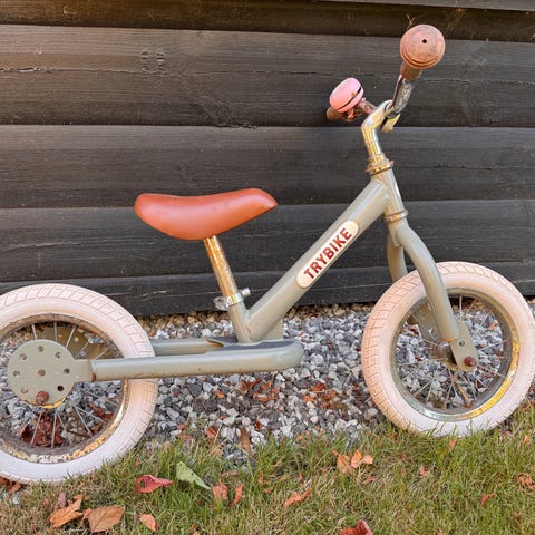 Islabike balancecykel i grå farve med brunt sæde og håndtag. Har 12 tommer hjul. Designet til børn til at lære balance og cykling uden pedaler.
