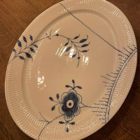 Royal Copenhagen Blå Mega Riflet 36 cm. Fadet har en lang og smal form, velegnet til servering eller som dekorativt element.