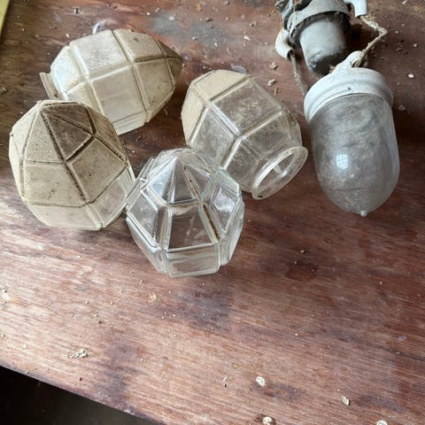 3 stk antikke glasampler. 2 med fatning og ledning. Uden fejl