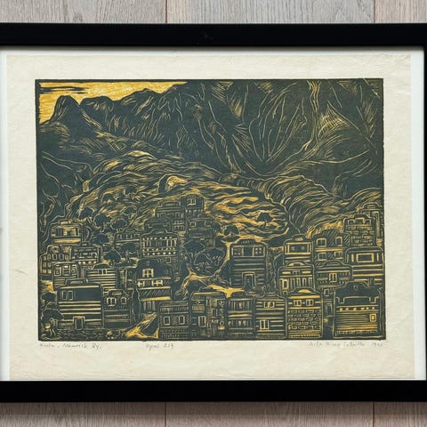 Værket er isat glas og ramme af egetræ og monteret bag passepartout i farven ‘chamois’.