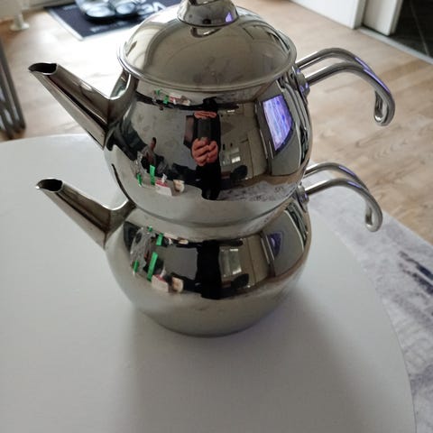 Forlift tekande i orange med rustfrit stål filter. Tekanden har en rund form med låg og håndtag, og filteret er designet til at holde teblade adskilt fra den bryggede te. Materialet er keramik med et metalfilter, og farven er orange.