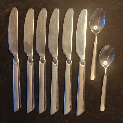 7 stk af hver: knive, gafler, skeer og teskeer.