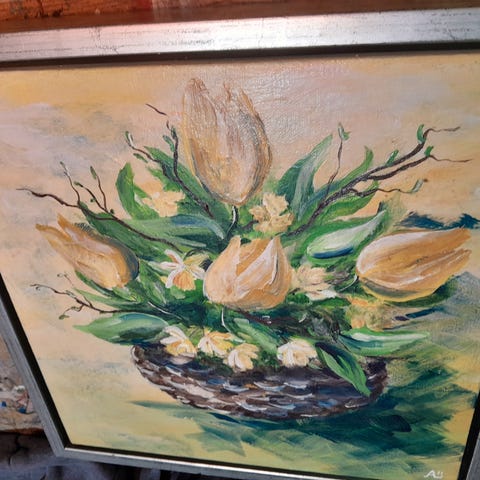 Abstrakt maleri med motiv af tulipaner i røde og beige nuancer. Maleriet er indrammet i en kobberfarvet ramme og har et rektangulært format. Velegnet til vægophæng i hjem eller kontor.