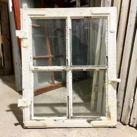 Fin, original og sjældent smal 4-ruders vinduesramme. Fremstpr med sundt træværk samt afskallende maling og god kit. Enkelte ruder i partiet mangler. Nye ruder medfølger uden beregning eller kan evt isættes for merpris.