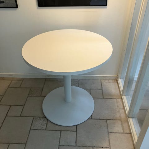 Flot cafébord fra Pedrali med bordplade i hvid laminat med sort kant. Søjlen er udført i poleret aluminium.
