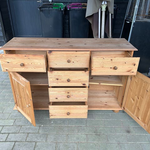 Andet, b: 38 l: 90, Købmandsdisk i lyslak fyrtræ med 10 skuffe l 90 d 38 h 80
