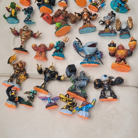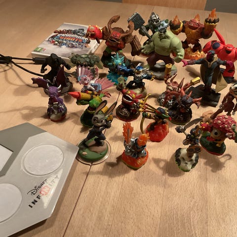 Samling af Skylanders figurer og tilbehør inklusive forskellige karakterer, biler og et hvidt rat. Figurerne er af forskellig størrelse og farve, egnet til samling eller leg.