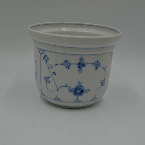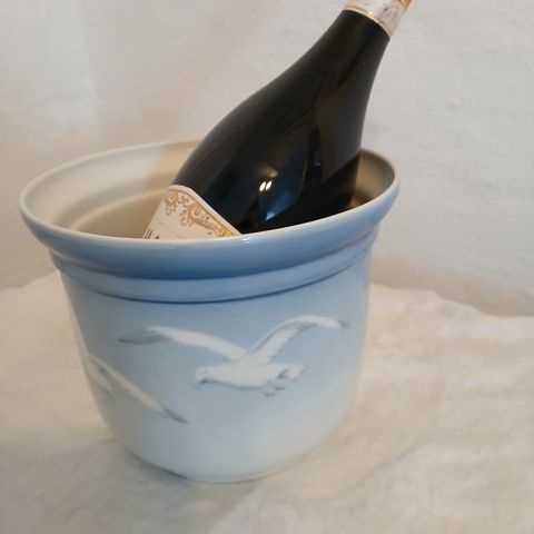 Bing & Grøndahl keramik krukke med blå kant og mågemotiv. Krukken er rund med en let udadgående kant og har en hvid og blå farve. Den er velegnet til opbevaring i køkkenet eller til dekorative formål. Brugsspor nede. Måske det kan fjernes