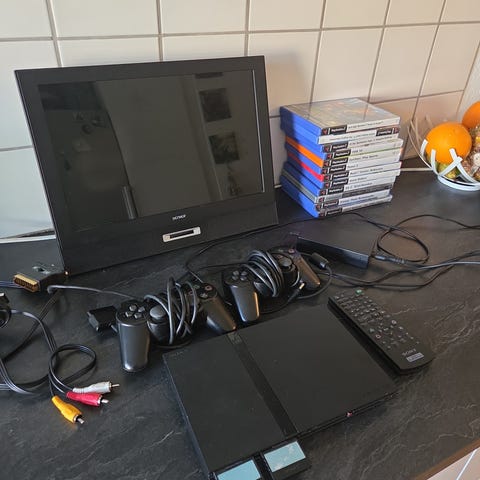 Playstation 2 slim med den sjældne Joytech monitor. Fornuftig stand, har en del overfladiske ridser, dog ikke noget man ser når man spiller. Inklusiv controller