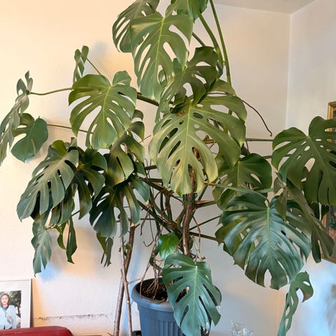 Monstera plante med store grønne blade, velegnet til indendørs brug. Planten har en fyldig vækst og kan bidrage til et grønt element i hjemmet eller kontormiljøet.