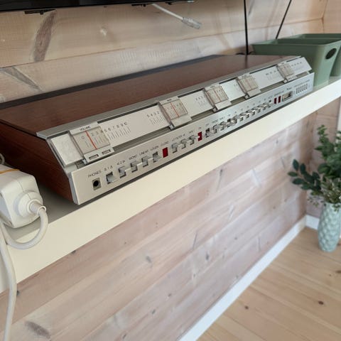 Bang & Olufsen vintage radio med kabinet i træ og metal.