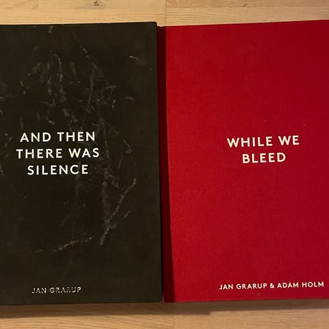 Fotobog med titlen 'And Then There Was Silence' indeholdende sort-hvide fotografier. Bogen indeholder billeder af mennesker og landskaber, herunder portrætter og træer. Bogen er signeret og præsenterer en samling af visuelle fortællinger i sort-hvidt.