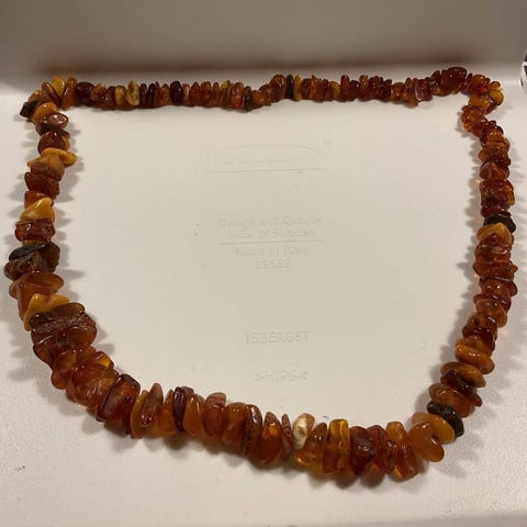 Flot lang ravkæde halskæde med uslebne/rå ravstykker.