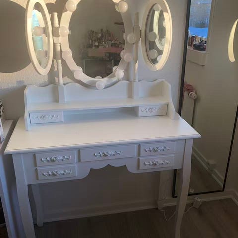 - LED-lys: Kosmetikbordet er forsynet med LED-pærer med USB, og det er let at skifte fra et varmt hvidt lys til koldt hvidt lys. LED-pærerne omkring spejlet fremhæver også din skønhed.