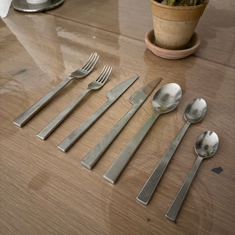 Lækket gedignt bestik i blank rustfrit stål, designet af Erik Bagger, og fra bestik serien Encore.
