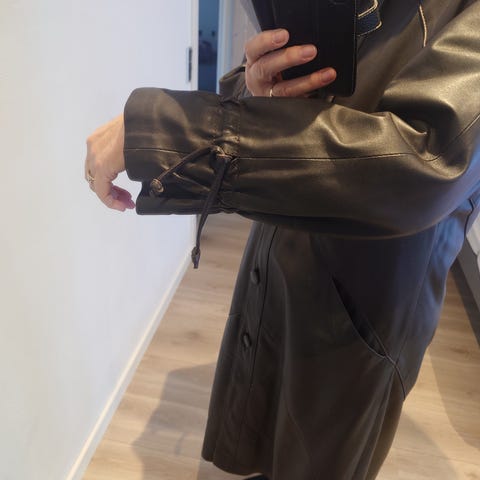 Lækker, blød skindfrakke, gennmknappet i sortblå farve, længden er 90 cm. Målt under ærmet er bredden 2x60 cm, når den er knappet, stand som næsten ny