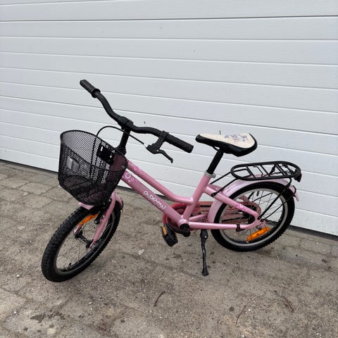 Everton børnecykel i lyserød farve med 16 tommer hjul. Cyklen er udstyret med både forreste kurv og bagagebærer bagpå. Den har et justerbart sæde og styr, samt en ringeklokke på styret. Der forekommer rust flere steder, men cyklen fungerer fint.