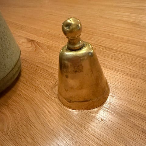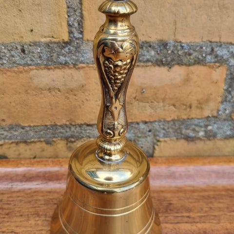 Håndklokke, 35 cm h, over 100 år gl, massiv messing