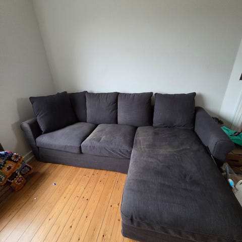 Der er brugsspor af katten på side af armlænet og den nederste del. Man kan sagtens købe delene separate hos Ikea, hvis man ikke kan leve med det 😉Ellers alle hynderne ser perfekt ud.