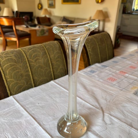 Mindre knoglevase i klart glas. Glasbobler i foden. Er lidt uklar nede ved bunden men er ellers hel og fin. Højde 19cm og diameter 6cm. Pris kr 80