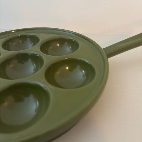 æbleskivepande. Brugt men med rigtig mange år i sig endnu. Det er af den ældre tunge slags, da den i sig selv vejer 1,5kg...KRAM DER BARE HOLDER 😜