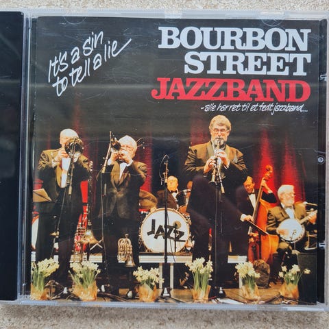 Bourbon Street Jazzband CD titled 'Up the Lazy River' featuring traditional jazz music. Released under Danica Records, catalog number DCD 2144. The album includes tracks such as 'Basin Street Blues,' 'Royal Garden Blues,' and 'Down by the Riverside.' Recorded in Silkeborg.