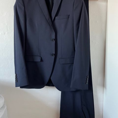 Her sælge et jakkesæt med nålestriber fra Inventailor. Stoffet er en medium til tung vægt og i en fantastisk nayv blå. 100 % uld. Jakken har en 2-knaps konfiguration med 2 slids. Meget god stand.