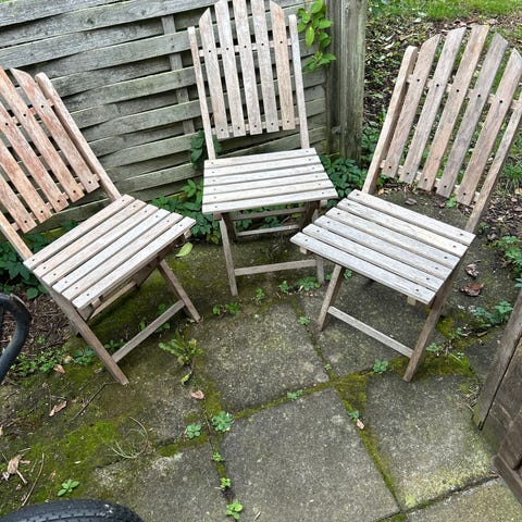 Sæt bestående af to havestole i træ. Stolene er foldbare for nem opbevaring og transport. Overfladen viser tegn på vejrslid og patina. Velegnet til udendørs brug i have eller på terrasse. Giv evt. en gang træolie eller maling for helt nyt look. Sælges samlet for 100 kr. i alt.