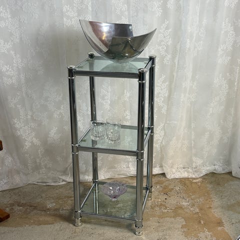 Flot reol i sortlakeret træ med skuffer og forkromet ramme.