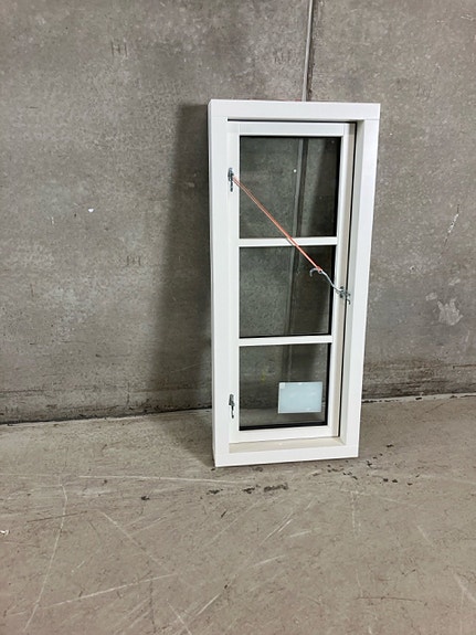 Bondehus vindue i træ alu med 2-lags energi rude, friskluftventil og redningsåbning. 3 fag med sprosseindeling til 4 ruder. Snavs fra byggeladsen forekommer.