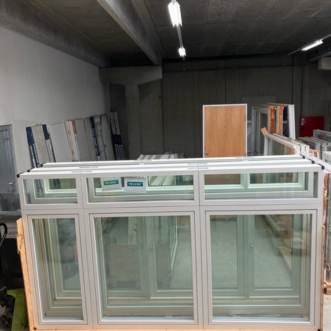 Sidehængt vindue i træ/alu med 3-lags energiruder. 3 faste øverst og 3 sidehængte nederst. Udfræst not i top, bund og venstre side for lysning og bundstykke.