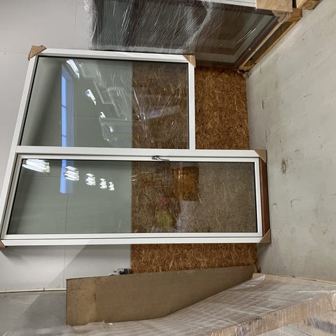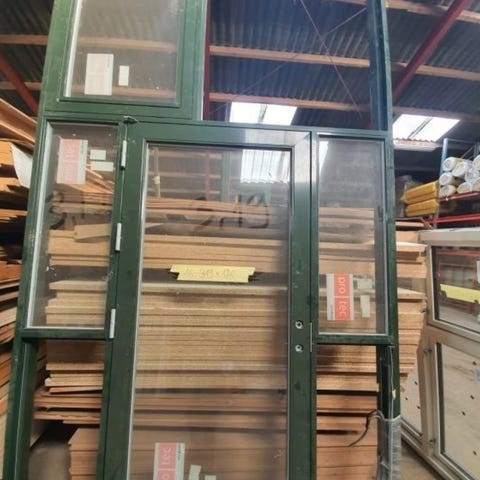 Terrassedørsparti i træ/alu med 3-lags energiruder og lavt alubundstykke. Der er monteret greb indvendigt i døren samt den sidehængte rude. Den sidehængte rude åbner højre ud og døren åbner venstre ud. Den er grå udvendigt og hvid indvendigt. Den fas