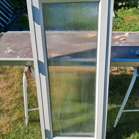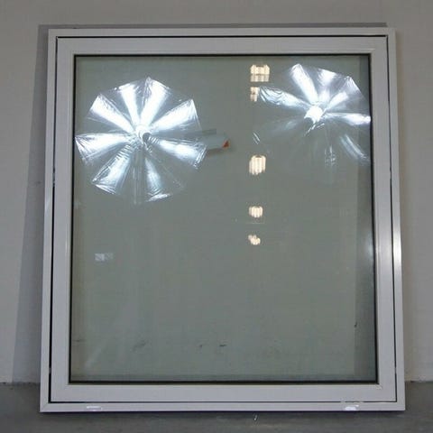 Topstyret/fast vindue med udluftning i midterste fag. Har skrammer.
