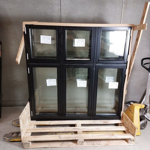 Dannebrogs vindue i træ med 2-lags energi ruder og paskvilgreb. Stormkrog og anverfere påmonteret. Udfræst not 4 sider for lysning og bundstykke. 3 fag 6 ruder.