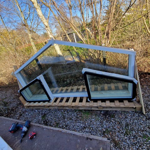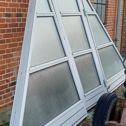 Asymetrisk gavlvindue i træ alu med 3-lags energi ruder og 4 topstyrede vinduer i midten med påmonteret paskvil greb. Bredde på højre del set udefra: 143 cm. Bredde op venstre del: 138 cm. Højde: ca. 296 cm. Sælges kun som sæt. 14 ruder.