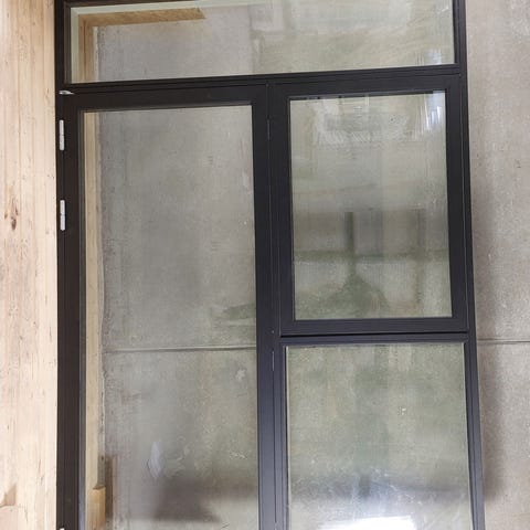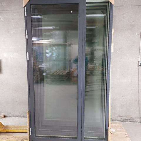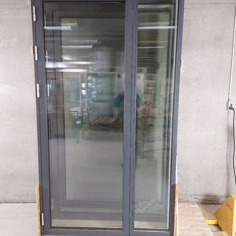 Terrassedør i træ/alu med 3-lags energiruder. Udfræst not i bund. Koks grå udvendig og hvid indvendig. Sideparti til højre og fast rude øverst, et udefra. Dimension på sideparti B:57 X H:165 cm. Højde på øverste rude 39 cm. Er beskidt. Overfladeridse