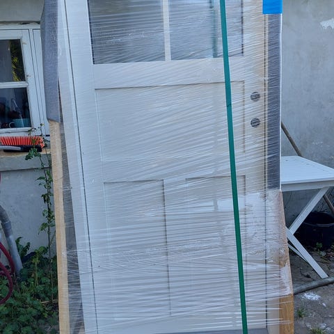 Facadedør lavet som pladedør med hårdttræs bundstykke og 3 punkts lås. Overfladeridser forekommer. Lille skade udvendig øverst i venstre hjørne.