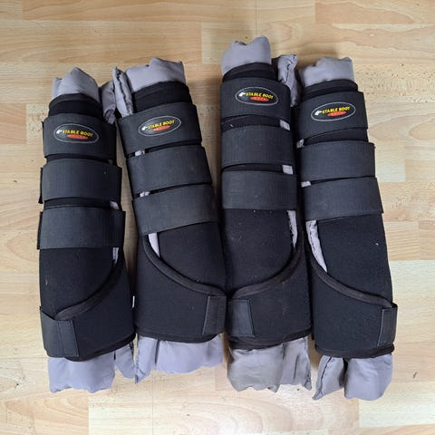 De er kun brugt 4 gange som transportgamacher, men ponyen har desværre fået trådt på dem, så 3 af indlæggene har reparationer helt nederst (kun udenfor gamachen). Det har ingen betydning for brug. Det er nemt at sprætte op, hvis man ønsker at sy det pænere.