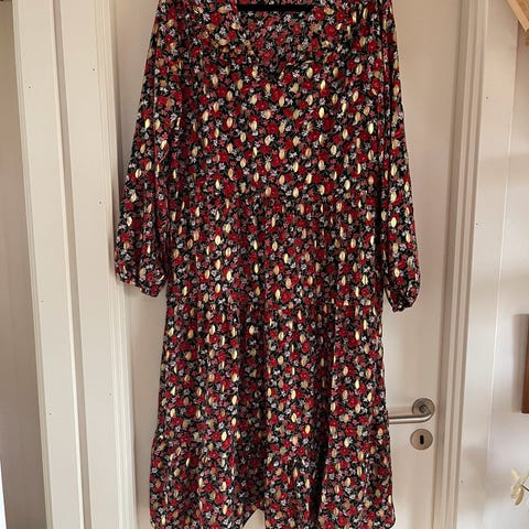 ONLY Maxi Sommerkjole i størrelse L, farven lyserød. Kjolen har korte ærmer, knaplukning foran og et mønstret design. Elastiktalje.