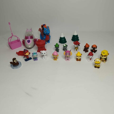 Paw Patrol lot. Bestående af flere figurer og forskellige køretøjer i forskellige farver. Sættet inkluderer karakterer og redningskøretøjer, der kan bruges til rolleleg og samling. Materialet er plastik, og det er designet til børn.