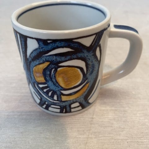 Kruset er lavet af keramik med farverig dekoration i blå nuancer. Det har en lige kant og en håndtag.,Afhentes i:,Røde Kors Horsens (615),Bemærk at mail, chat og beskeder ikke besvares, og varen skal købes på knappen "Gå til varen"