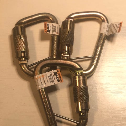 Meget stor, fjederbelastet karabinhage til fx flexlift. Karabinhagen er forsynet med blødt beskyttende skumgummi belægning på den ene side, så den ikke laver mærker i håndtaget på hækkeklipperen. Størrelse/højde: 200 mm Godstykkelse: 14 mm Bemærk - ikke beregnet til klatring!