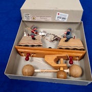 Træfigur med tilhørende flyvemaskine legetøj fremstillet i træ med blå og naturlige træfarver. Figuren er udstyret med bevægelige dele og er designet til ophængning. Velegnet som dekorativt element eller som legetøj.