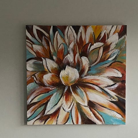 Maleri med motiv af en blomstereng og et vandfald indrammet i en enkel træ ramme.Farverne inkluderer grønt, rødt, Hvidt ogblå. Passer til dekoration af væg i stue eller kontor.