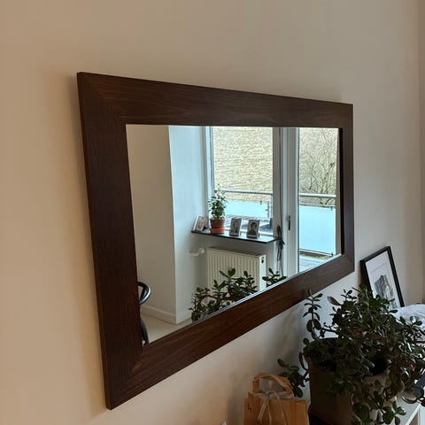 Spejl med træramme. Højde 116 cm, bredde 86 cm, dybde ca. 3 cm.