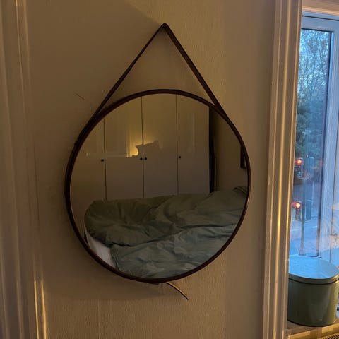 Hay rundt vægspejl med en ramme i metal og en rem til ophæng. Spejlet har en enkel og moderne design, der passer til forskellige indretningstyper. Velegnet til ophængning i entré, stue eller soveværelse.