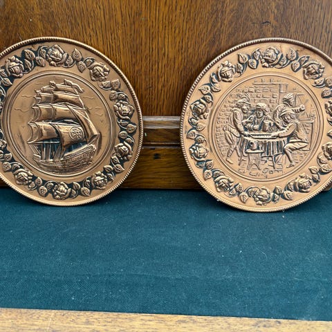Dekorativ vægplade med motiv af Den Lille Havfrue, fremstillet i kobber. Pladen har detaljeret reliefarbejde og en rund form med dekorativ kant. Velegnet til ophængning som vægdekoration.